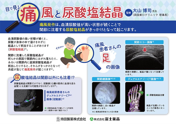 PDFをダウンロード血清尿酸値が高い状態が続くことで関節に沈着する「尿酸塩結晶」と痛風発作の関係について、関節エコー画像やデュアルエナジーCT画像などを用いて、ビジュアルに解説しています。